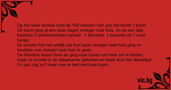 De bazin ging al een paar dagen vroeger naar huis. en op een dag kwamen 3 werkneemsters samen : 1 blondine, 1 brunette en 1 rood harige.