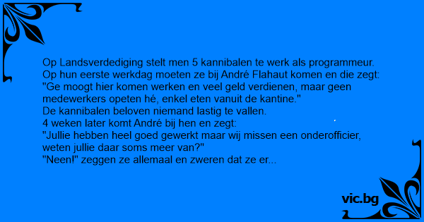 På et kontor bliver 5 kannibaler ansat som kontorassistenter. Ved tiltrædelsen siger chefen: - I har nu fast arbejde, I tjener godt og kan spise i vores kantine - så lad de andre være i fred....