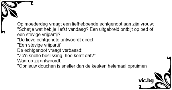 Op moederdag vraagt een liefhebbende echtgenoot aan zijn vrouw: