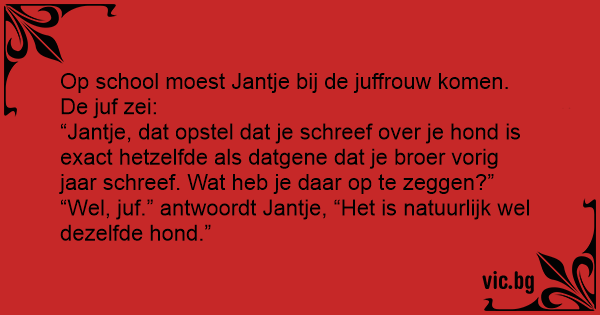 “Wel, juf.” antwoordt Jantje, “Het is natuurlijk wel dezelfde hond.”