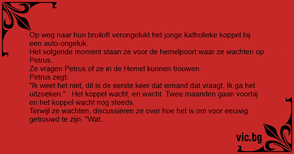 Terwijl ze wachten, discussiëren ze over hое het is om voor eeuwig getrouwd te zijn. "Wat als het niet werkt," vragen ze zich af, "zitten we dan voor eeuwig aan elkaar vast?" Na 3 maand keert Petrus eindelijk terug. "Ja", zegt hij, "jullie kunnen trouwen in de hemel."
