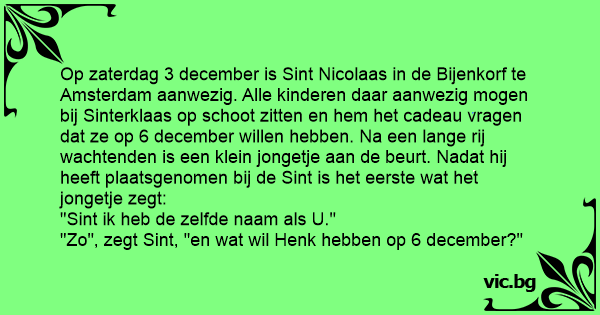 Op zaterdag 3 december is Sint Nicolaas in de Bijenkorf te Amsterdam aanwezig. Alle kinderen daar aanwezig mogen bij Sinterklaas op schoot zitten en hem het cadeau vragen dat ze op 6 december willen hebben. Na een lange rij wachtenden is een klein jongetje aan de beurt. Nadat hij heeft plaatsgenomen bij de Sint is het eerste wat het jongetje zegt: