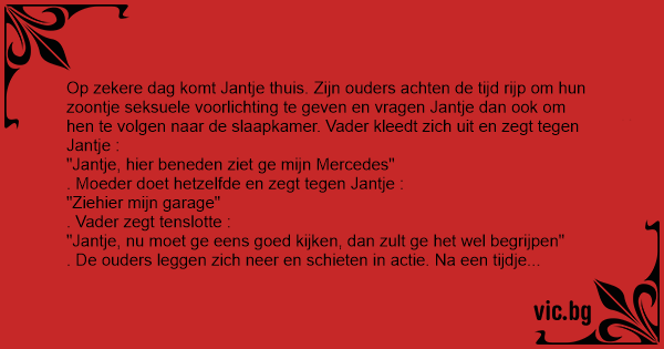 Op zekere dag komt Jantje thuis. Zijn ouders achten de tijd rijp om hun zoontje seksuele voorlichting te geven en vragen Jantje dan ook om hen te volgen naar de slaapkamer. Vader kleedt zich uit en zegt tegen Jantje :