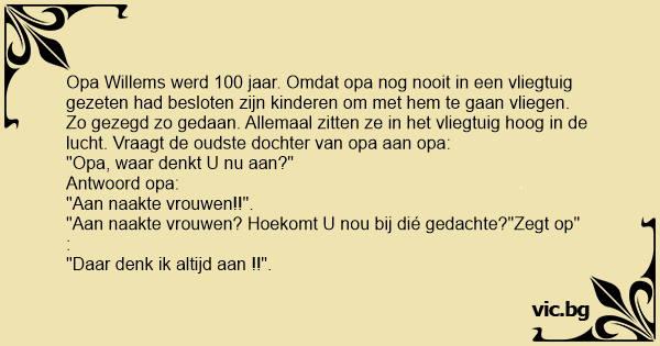 Opa Willems werd 100 jaar. Omdat opa nog nooit in een vliegtuig gezeten had besloten zijn kinderen om met hem te gaan vliegen. Zo gezegd zo gedaan. Allemaal zitten ze in het vliegtuig hoog in de lucht. Vraagt de oudste dochter van opa aan opa: