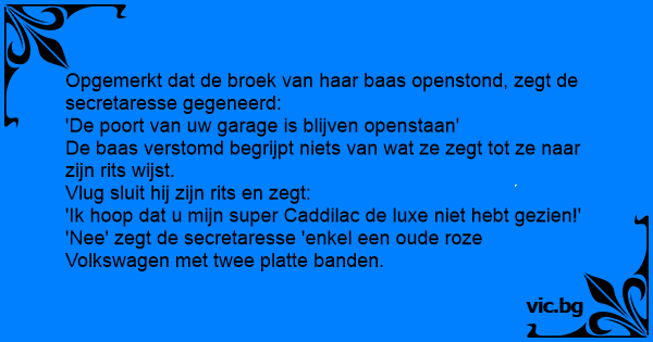 Une sécretaire remarque que la braguette du pantalon de son patron est ouverte. Alors elle lui dit en lui montrant du doigt : - Heu Monsieur la porte de votre garage est resté ouverte Il...