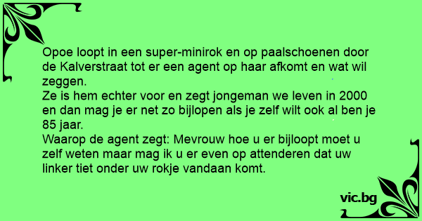 Waarop de agent zegt: Mevrouw hое u er bijloopt moet u zelf weten maar mag ik u er even op attenderen dat uw linker tiet onder uw rokje vandaan komt.