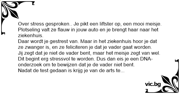 Daar wordt je gestrest van. Maar in het ziekenhuis hoor je dat ze zwanger is, en ze feliciteren je dat je vader gaat worden.
