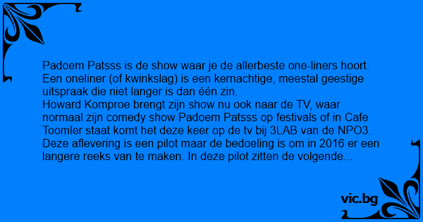 Padoem Patsss is de show waar je de allerbeste one-liners hoort. Een oneliner (of kwinkslag) is een kernachtige, meestal geestige uitspraak die niet langer is dan één zin.