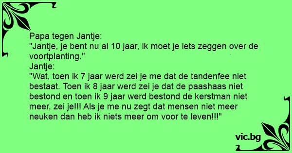 "Jantje, je веnт nu al 10 jaar, ik moet je iets zeggen over de voortplanting."
