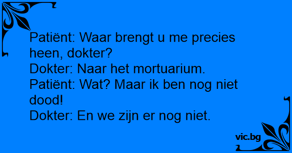 «Hvor tar du meg egentlig» spurte pasienten. «Til likhuset» svarte legen. «Hva?» Pasienten fikk panikk. «Men jeg er ikke død ennå!» «Så er vi heller ikke der ennå» sa legen.