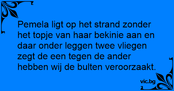 Pemela ligt op het strand zonder het topje van haar bekinie aan en daar onder leggen twee vliegen zegt de een tegen de ander hebben wij de bulten veroorzaakt.