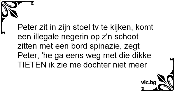 Peter zit in zijn stoel tv te kijken, komt een illegale negerin op z'n schoot zitten met een bord spinazie, zegt Peter; 'he ga eens weg met die dikke TIETEN ik zie me dochter niet meer