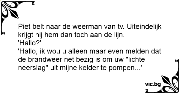 'Hallo, ik wou u alleen maar even melden dat de brandweer net bezig is om uw "lichte neerslag" uit mijne kelder te pompen...'
