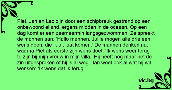 Piet, Jan en Leo zijn door een schipbreuk gestrand op een onbewoond eiland, ergens midden in de oceaan. Op een dag komt er een zeemeermin langsgezwommen. Ze spreekt de mannen aan: ‘Hallo mannen, Jullie mogen alle drie één wens doen, die ik uit laat komen.’ De mannen denken na, waarna Piet als eerste zijn wens doet: ‘Ik wens weer terug te zijn bij mijn vrouw in mijn villa.’ Hij heeft nog maar net de zin uitgesproken of hij is al weg. Jan weet ook al wat hij wil wensen: ‘Ik wens dat ik terug ben op mijn boerderij.’ Niet veel later is ook Jan verdwenen. Leo denkt nog even na. Uiteindelijk zegt Leo: ‘Weet je, het is hier toch wel saai zonder Piet en Jan. Ik wou dat ze terug waren.’ En hup, het trio zit weer op het eiland!