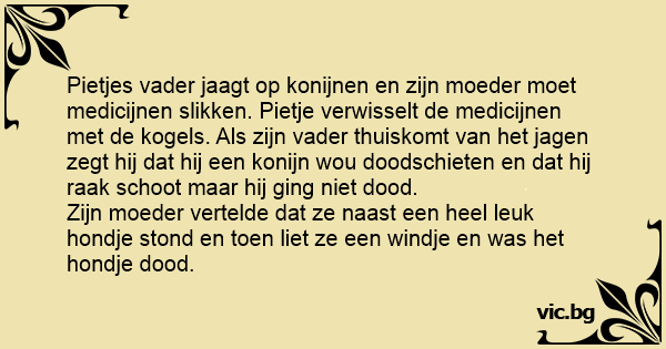 Pietjes vader jaagt op konijnen en zijn moeder moet medicijnen slikken. Pietje verwisselt de medicijnen met de kogels. Als zijn vader thuiskomt van het jagen zegt hij dat hij een konijn wou doodschieten en dat hij raak schoot maar hij ging niet dood.