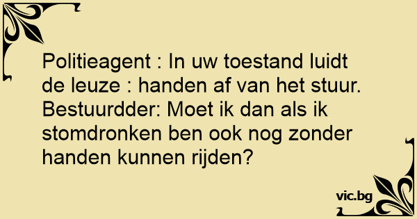 Politieagent : In uw toestand luidt de leuze : handen af van het stuur.