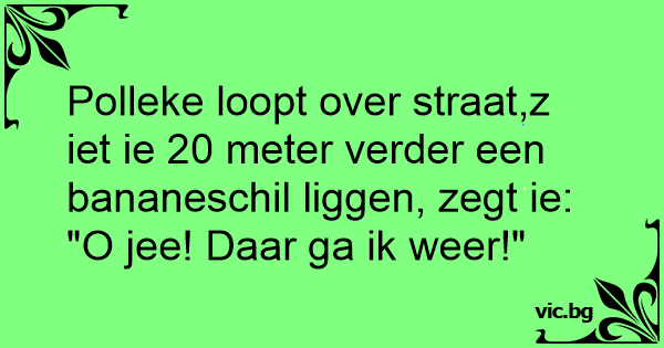 Polleke loopt over straat,z iet ie 20 meter verder een bananeschil liggen, zegt ie:
