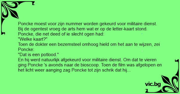 Poncke moest voor zijn nummer worden gekeurd voor militaire dienst. Bij de ogentest vroeg de arts hem wat er op de letter-kaart stond. Poncke, die net deed of ie slecht ogen had: