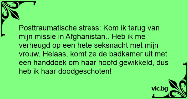Posttraumatische stress: Kom ik terug van mijn missie in Afghanistan.. Heb ik me verheugd op een hete seksnacht met mijn vrouw. Helaas, komt ze de badkamer uit met een handdoek om haar hoofd gewikkeld, dus heb ik haar doodgeschoten!