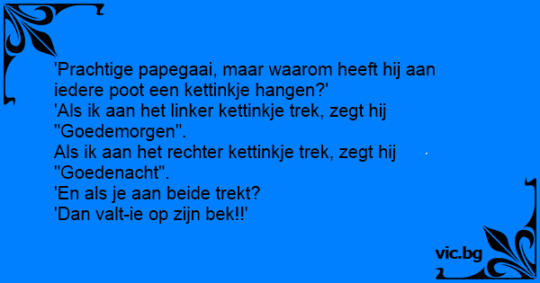 Een meneer komt in de dierenwinkel Hij ziet een papegaai. Hij vraagt aan de verkoper : kan die papegaai ook praten? De verkoper zegt : ja als je aan z'n linkerpootje trekt zegt hij:goedemorgen!, En...