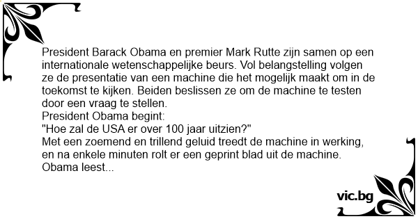 President Barack Obama en premier Mark Rutte zijn samen op een internationale wetenschappelijke beurs. Vol belangstelling volgen ze de presentatie van een machine die het mogelijk maakt om in de toekomst te kijken. Beiden beslissen ze om de machine te testen door een vraag te stellen.