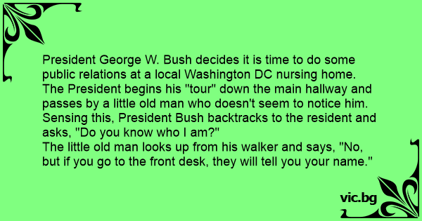 Sensing this, President Bush backtracks to the resident and asks, "Do you know who I am?"