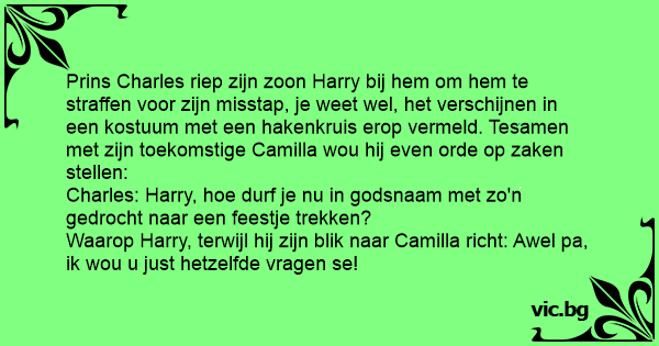 Prins Charles riep zijn zoon Harry bij hem om hem te straffen voor zijn misstap, je weet wel, het verschijnen in een kostuum met een hakenkruis erop vermeld. Tesamen met zijn toekomstige Camilla wou hij even orde op zaken stellen: