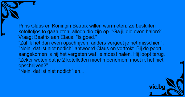 Prins Claus en Koningin Beatrix willen warm eten. Ze besluiten kotelletjes te gaan eten, alleen die zijn op. "Ga jij die even halen?" Vraagt Beatrix aan Claus. "Is goed."