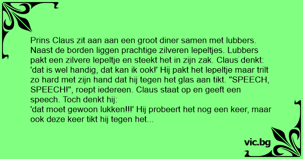 Prins Claus zit aan aan een groot diner samen met lubbers. Naast de borden liggen prachtige zilveren lepeltjes. Lubbers pakt een zilvere lepeltje en steekt het in zijn zак. Claus denkt: