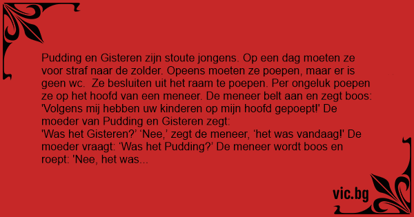 'Was het Gisteren?’ ‘Nee,’ zegt de meneer, ‘het was vandaag!' De moeder vraagt: ‘Was het Pudding?’ De meneer wordt boos en roept: 'Nee, het was роер!' ‘Nou,’ zegt de moeder, ‘dan zijn het mijn kinderen niet geweest!'