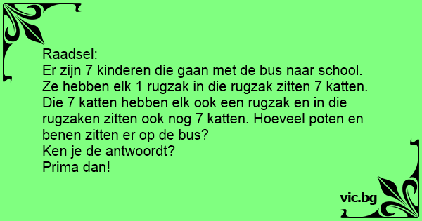 Er zijn 7 kinderen die gaan met de bus naar school. Ze hebben elk 1 rugzak in die rugzak zitten 7 katten. Die 7 katten hebben elk ook een rugzak en in die rugzaken zitten ook nog 7 katten. Hoeveel poten en benen zitten er op de bus?
