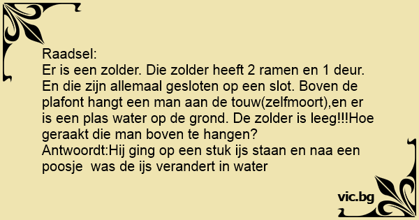 Er is een zolder. Die zolder heeft 2 ramen en 1 deur. En die zijn allemaal gesloten op een slot. Boven de plafont hangt een man aan de touw(zelfmoort),en er is een plas water op de grond. De zolder is leeg!!!Ное geraakt die man boven te hangen?