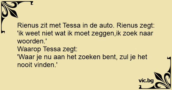 Rienus zit met Tessa in de auto. Rienus zegt:<br />'ik weet niet wat ik moet zeggen,ik zoek naar woorden.'<br />Waarop Tessa zegt:<br />'Waar je nu aan het zoeken веnт, zul je het nooit vinden.'