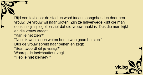 Rijd een taxi door de stad en word ineens aangehouden door een vrouw. De vrouw wil naar Sloten. Zijn ze halverwege kijkt die man eens in zijn spiegel en ziet dat die vrouw naakt is. Dus die man kijkt en die vrouw vraagt: