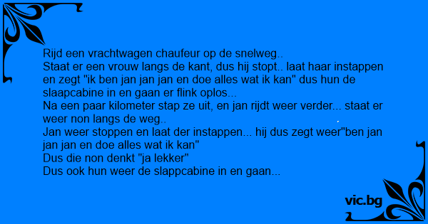 Staat er een vrouw langs de kant, dus hij stopt.. laat haar instappen en zegt "ik ben jan jan jan en doe alles wat ik kan" dus hun de slaapcabine in en gaan er flink oplos...