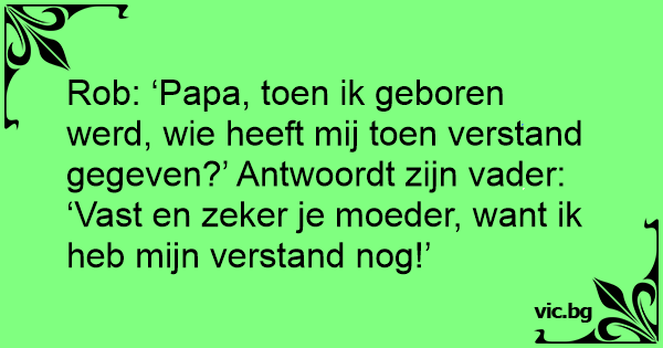 Rob: ‘Papa, toen ik geboren werd, wie heeft mij toen verstand gegeven?’ Antwoordt zijn vader: ‘Vast en zeker je moeder, want ik heb mijn verstand nog!’