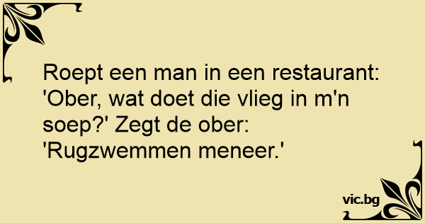 'Ober, wat doet die vlieg in m'n soep?' Zegt de ober: