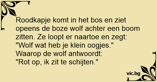 Rotkäppchen geht durch den Wald und trifft hinter einem Gebüsch den bösen Wolf. Fragt Rotkäppchen: "Du Wolf, warum hast du denn so große Augen?" Darauf der Wolf: "Nicht mal in Ruhe scheißen kann...