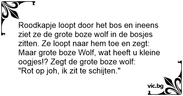 Roodkapje loopt door het bos en ineens ziet ze de grote boze wolf in de bosjes zitten. Ze loopt naar hem toe en zegt: Maar grote boze Wolf, wat heeft u kleine oogjes!? Zegt de grote boze wolf: