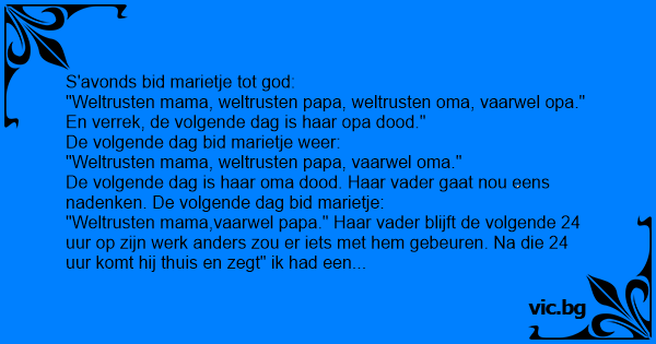 "Weltrusten mama, weltrusten papa, weltrusten oma, vaarwel opa." En verrek, de volgende dag is haar opa dood."
