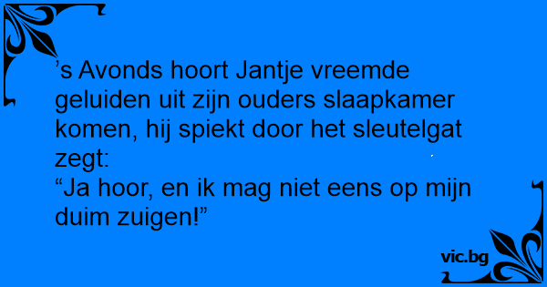 ’s Avonds hoort Jantje vreemde geluiden uit zijn ouders slaapkamer komen, hij spiekt door het sleutelgat zegt: