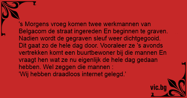 's Morgens vroeg komen twee werkmannen van Belgacom de straat ingereden En beginnen te graven. Nadien wordt de gegraven sleuf weer dichtgegooid. Dit gaat zo de hele dag door. Vooraleer ze 's avonds vertrekken komt een buurtbewoner bij die mannen En vraagt hen wat ze nu eigenlijk de hele dag gedaan hebben. Wel zeggen die mannen :