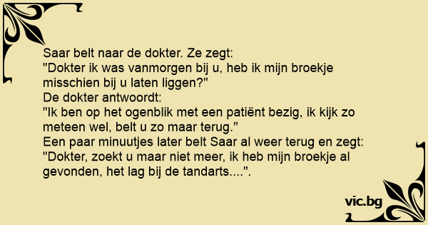 "Dokter, zoekt u maar niet meer, ik heb mijn broekje al gevonden, het lag bij de tandarts....".