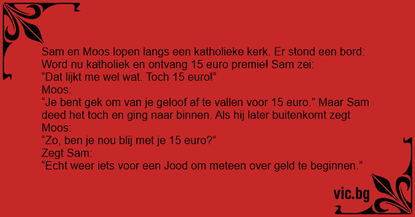 Sam en Moos lopen langs een katholieke kerk. Er stond een bord: Word nu katholiek en ontvang 15 euro premie! Sam zei: