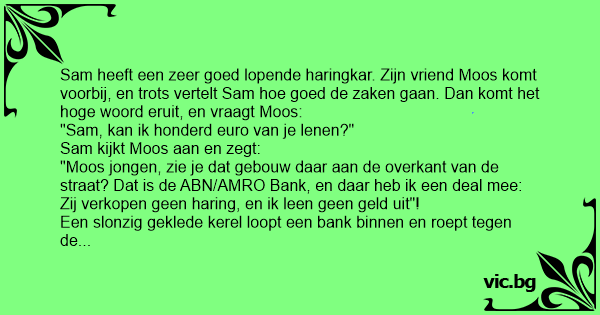 "Moos jongen, zie je dat gebouw daar aan de overkant van de straat? Dat is de ABN/AMRO Bank, en daar heb ik een deal mee: Zij verkopen geen haring, en ik leen geen geld uit"!