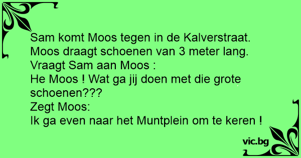 Sam komt Moos tegen in de Kalverstraat. Moos draagt schoenen van 3 meter lang. Vraagt Sam aan Moos :