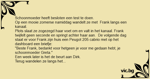 Une belle mère veut tester ses 3 gendres. Elle les prend un par un et décide à chaque fois de simuler une chute à l'eau. Le premier sans hésiter, saute à l'eau et vient la sauver de la noyade. Le lendemain, il retrouve devant sa maison une jolie Peugeot avec un mot "De la part de ta belle mère...