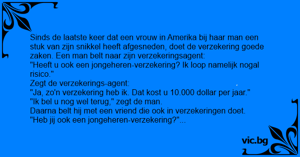 "Jazeker," zegt zijn vriend, "dat kost je 1.000 dollar per jaar, maar dan ben je tegen alle risico's verzekerd: snijden, bijten, hakken, schuren..."