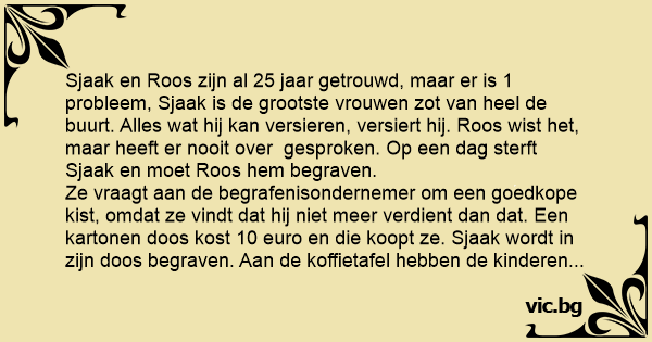 Sjaak en Roos zijn al 25 jaar getrouwd, maar er is 1 probleem, Sjaak is de grootste vrouwen zot van heel de buurt. Alles wat hij kan versieren, versiert hij. Roos wist het, maar heeft er nooit over gesproken. Op een dag sterft Sjaak en moet Roos hem begraven.