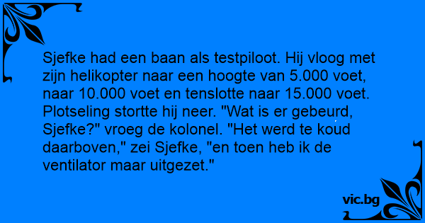 Sjefke had een baan als testpiloot. Hij vloog met zijn helikopter naar een hoogte van 5.000 voet, naar 10.000 voet en tenslotte naar 15.000 voet. Plotseling stortte hij neer. "Wat is er gebeurd, Sjefke?" vroeg de kolonel. "Het werd te koud daarboven," zei Sjefke, "en toen heb ik de ventilator maar uitgezet."